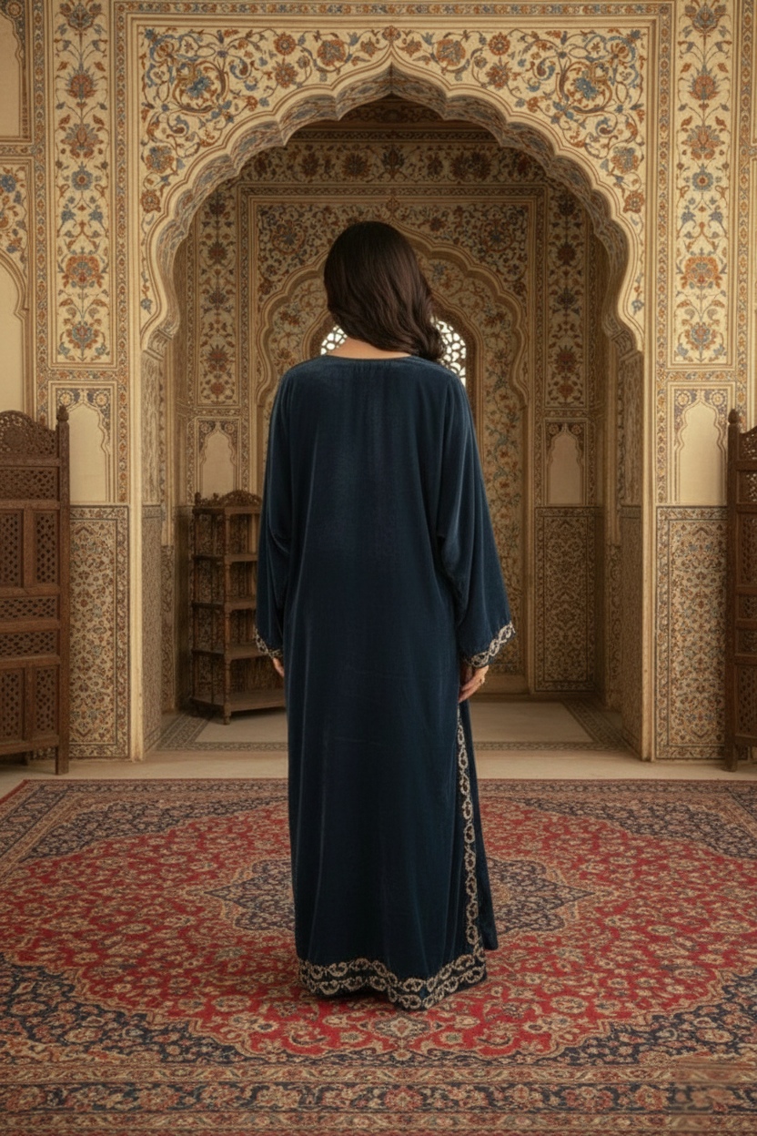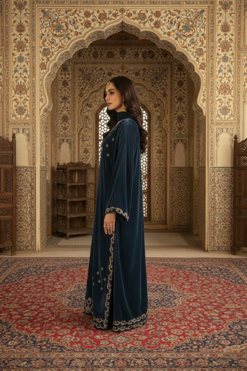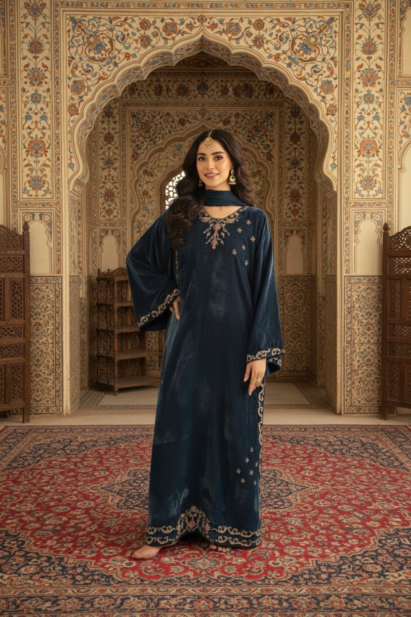Crafted on a velvet shirt, it is adorned with intricate kora, dabka, thread work, sequins, and nakshi featuring along neckline, sleeves, and complete shirt front , enhanced with embellished scallop details. It is paired with plain pants and a medium silk dupatta, finished with luxurious velvet trims for a refined, statement-making look.