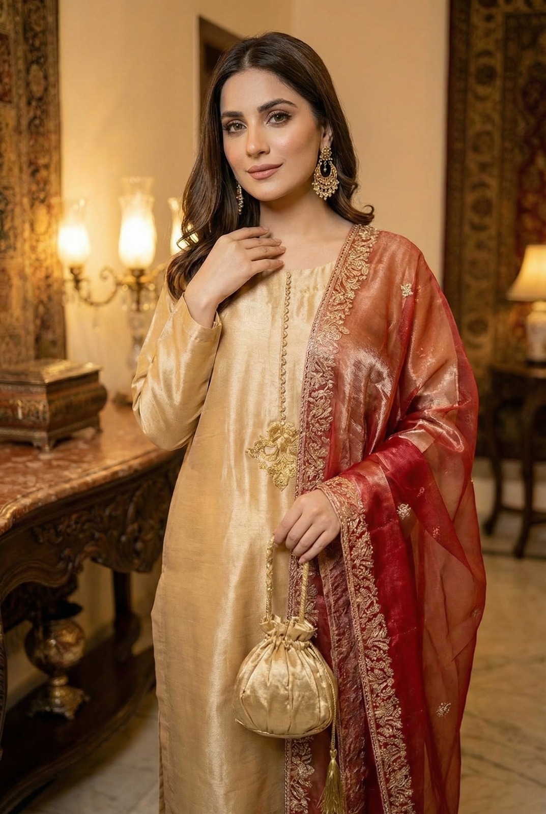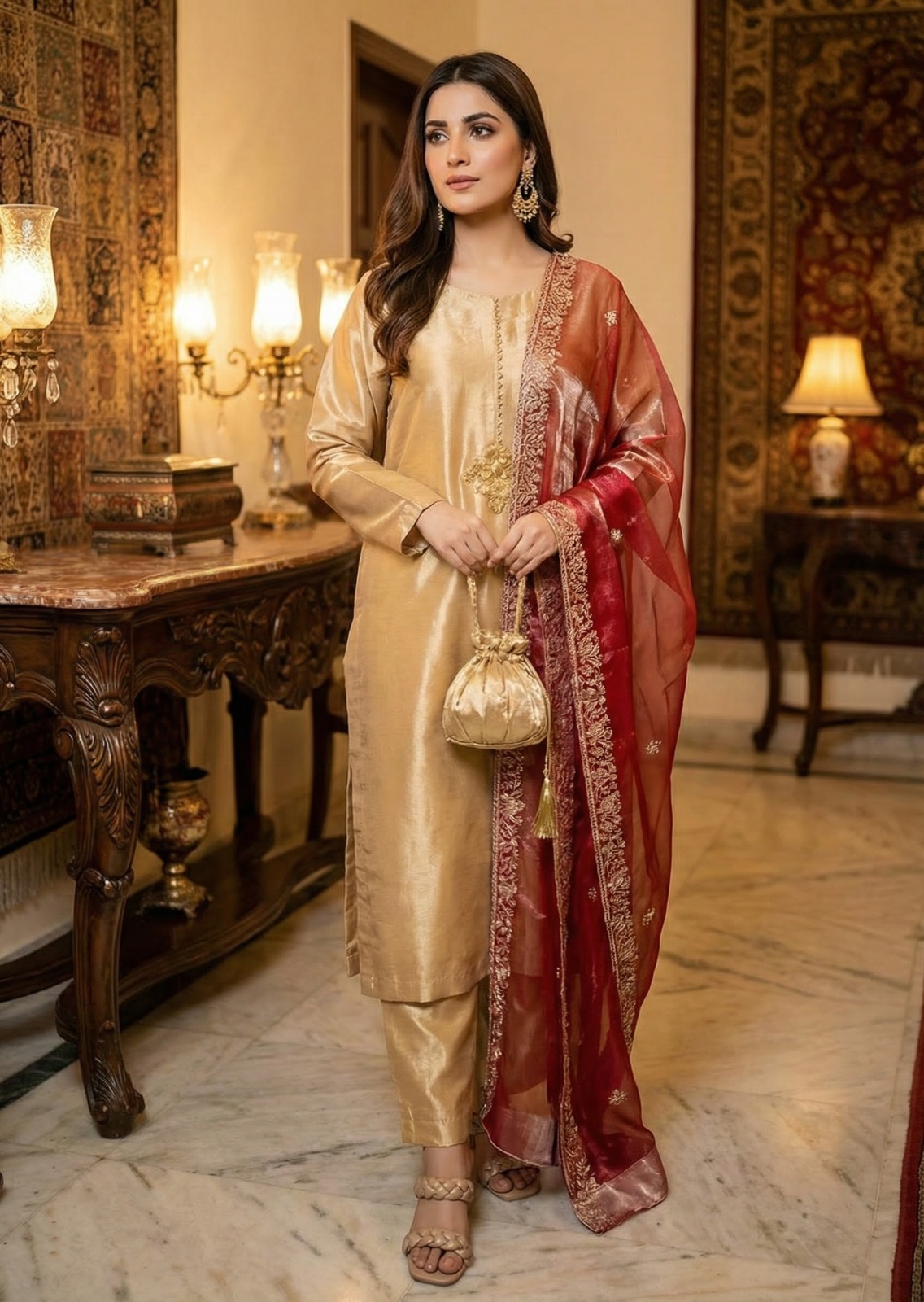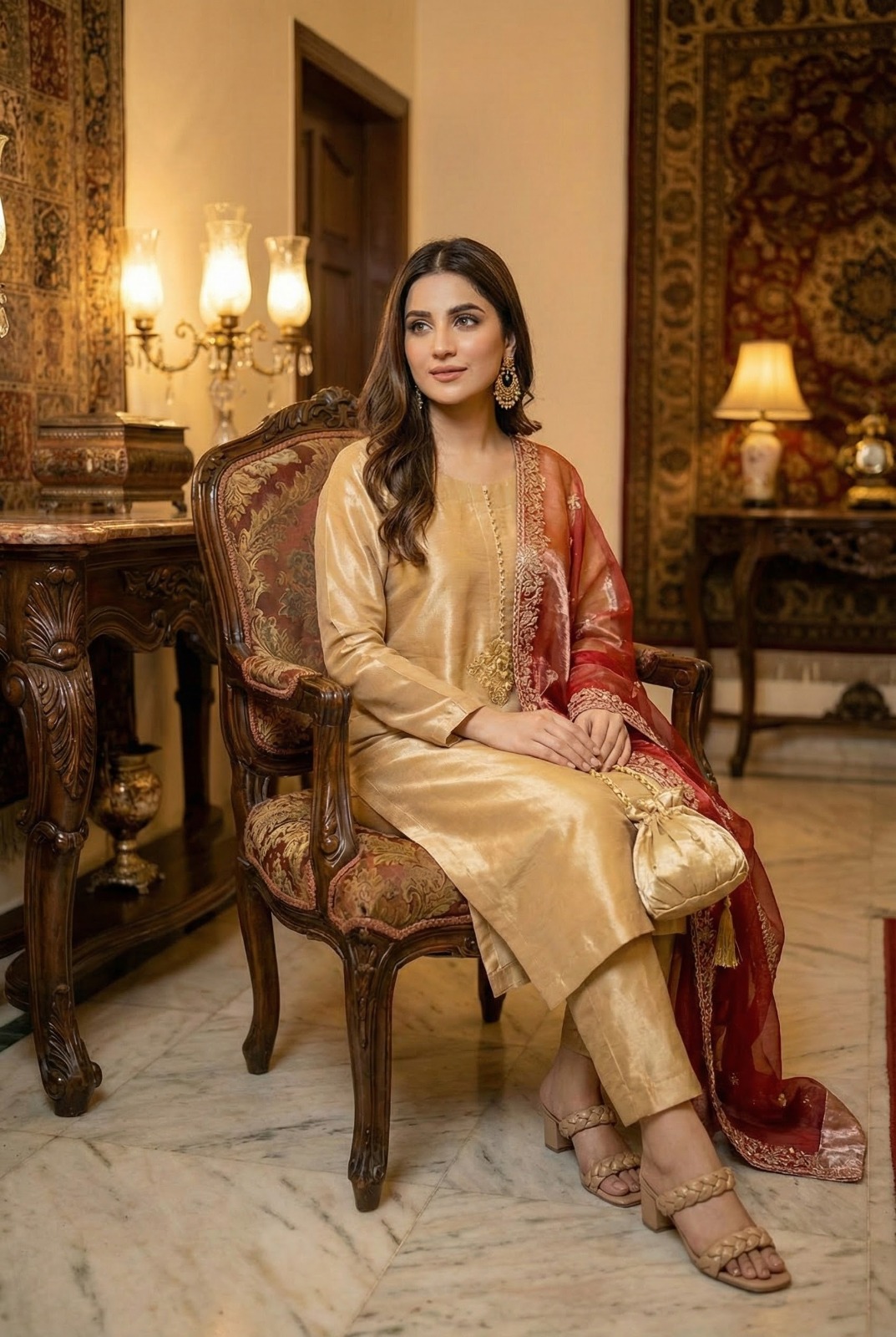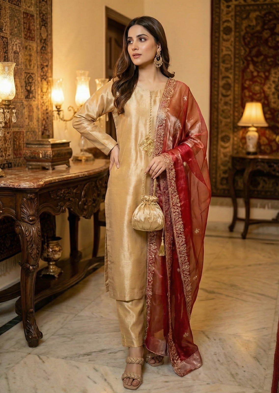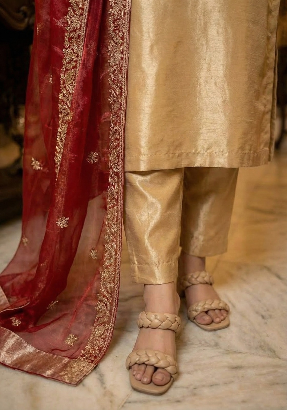 1. This gold Zari Silk outfit is exquisitely adorned with intricate kora, dabka, nakshi, and sequin embellishments, creating a rich, opulent look. It is paired with straight pants and a pure shesha silk dupatta, beautifully hand-embellished with mukesh and embroidery for an added touch of elegance.